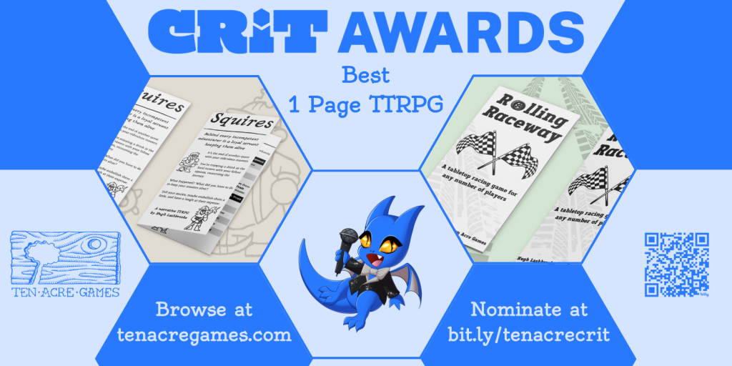 Whether you nominate any of our work or not, here’s a 15% discount code for any purchase on the Ten Acre Games store: 15ACRE