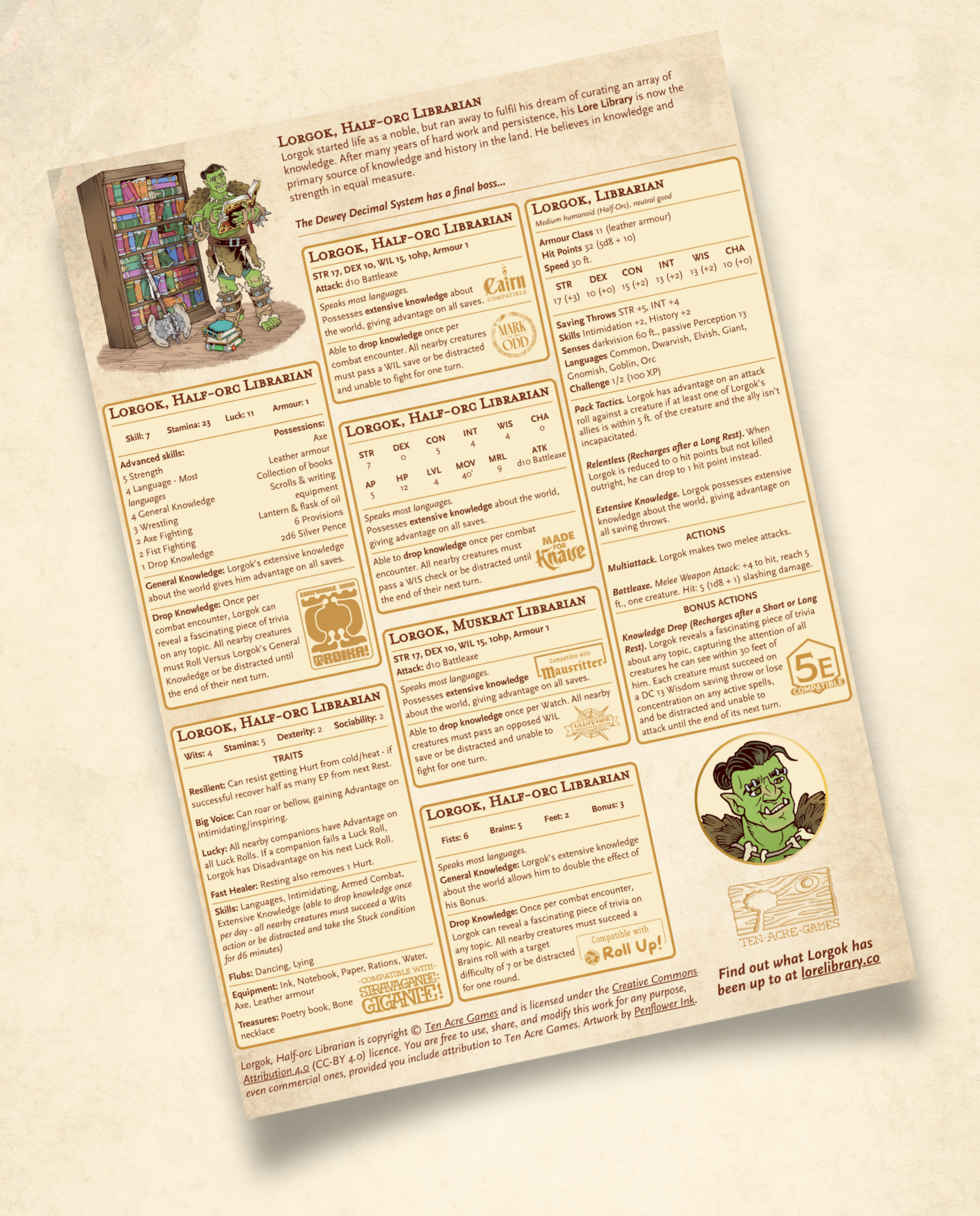 So here he is – a fully-usable non-player character (NPC) suitable for any tabletop roleplaying game. He’s more than just a great picture though, Lorgok comes with detailed stat blocks for 9 different games and systems: