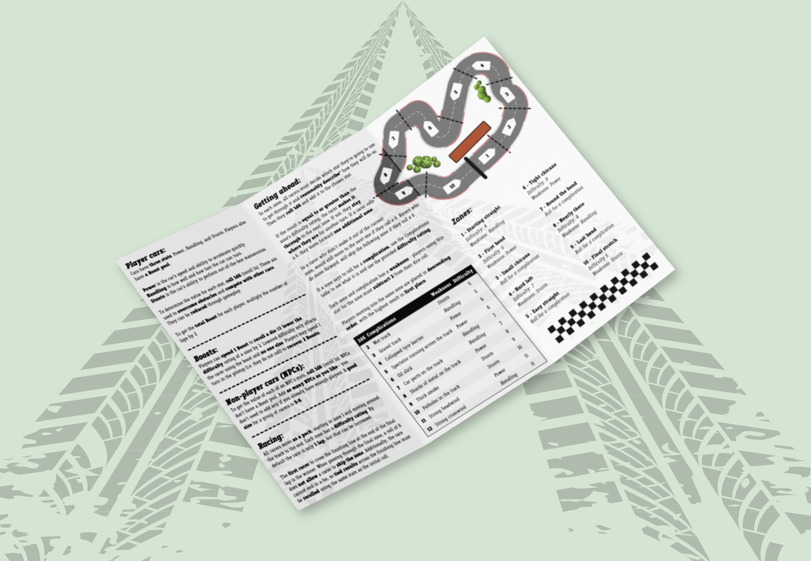 Each race will be different, with a table of complications to introduce some randomness into what you experience. Use your three stats (Power, Handling, and Stunts) to navigate your way around a series of difficulties, while trying to stay ahead of your opponents.