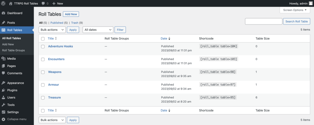 - Activate the plugin, and you will see a new ‘Roll Tables’ section in your WordPress dashboard.