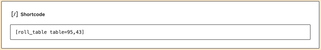 Roll Tables are displayed using shortcodes. WordPress shortcodes are text within square brackets that allow you to display dynamic content. The screenshots above show what the shortcodes look like for individual Roll Tables or Roll Table Groups. To add a shortcode to your post, select the ‘Shortcode’ block from your block inserter and type or paste the shortcode into the text field: