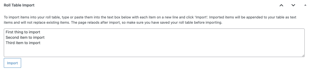 To import roll table items, type or paste them into the text box with each item on a new line. Each line will be imported as a new item in the Roll Table and they will be appended to the existing items, so you can do this safely without overwriting anything. All items will be imported as text items. The page will reload after clicking the ‘Import’ button, so make sure you have saved any existing Roll Table Items